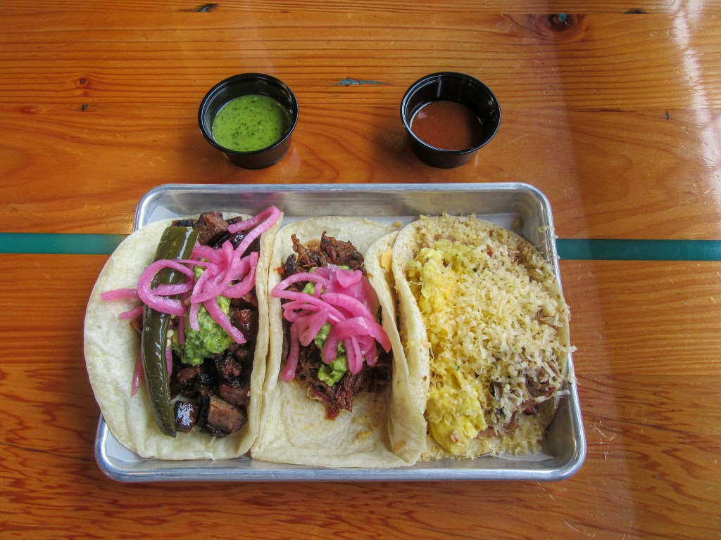 Enough of the yakety yak. Let’s get to the food. I got 3 tacos: brisket, sausage and the pulled pork breakfast taco. Their brisket is incredible, probably my favorite of their meats. Their standard taco comes with pickled red onions and guacamole, which should be an industry standard. Quality smoked meats, handmade tortillas, pickled red onions and guacamole. A great lineup, though often they are a bit dry so adding salsa helps make it a more cohesive taco. As any Texan knows, ya gotta put salsa on your breakfast tacos! I recommend the brisket, but also the sausage. It might sound a bit strange (chopped sausage taco?) but it is very tasty and worth ordering. A small grievance: I added smoked jalapeños to mine, but they didn’t chop the jalapeño, leaving it whole. Chop that thing up so that I get jalapeños in each bite instead of eating the whole pepper in one bite. The pulled pork breakfast taco didn’t fare as well, wouldn’t recommend this one. It was pretty bland, the meat didn’t shine through with the eggs and beans. Required more salsa. Definitely worth going here if you’ve never been (is that even possible?) and if you want to avoid the crazy lines at the Mississippi spot. Although there was a sizable line here, the food came pretty quick, plus you can grab a drink at the bar at Hinterland. They have a nice outside setup, with heaters that make it possible to enjoy eating outside on the covered patio on a chilly day. My other grievance is their computerized ordering system and the fact that they don’t take cash. I fear the day where I can’t order from a human and pay cash…