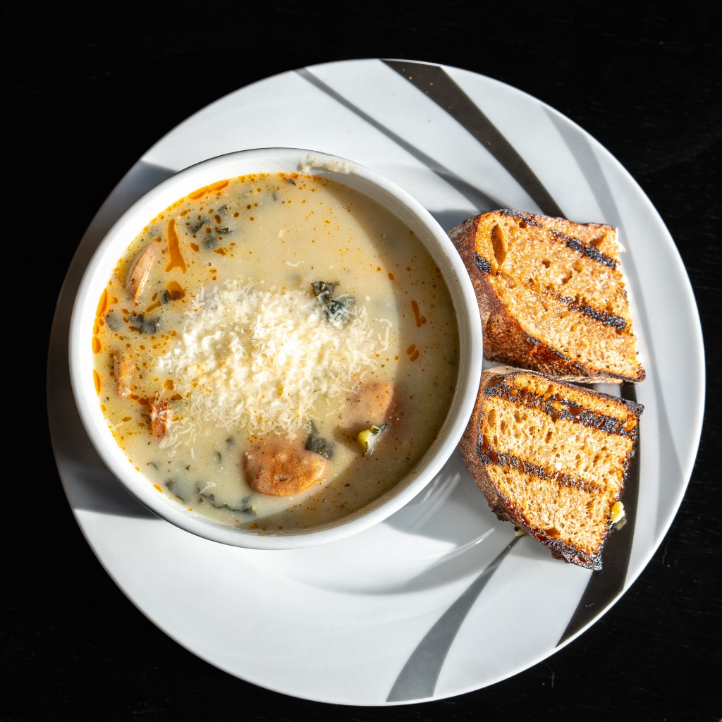 Pictured above is from my first visit. The “Lucky Caldo” with creamy potato parmesan broth, smoked chorizo, kale, heirloom ayocote beans and lemon oil. First off, delicious. This might be my favorite of the three, if I had to choose. Both familiar (potato, sausage) and unique (heirloom beans, lemon oil) it felt both comforting and nourishing, while also being very crave-able. The bread that they use is from local favorite Tabor Bread. A red wheat, is is hearty and delicious and pairs perfectly with the soups. They grill it, brush it with oil, and serve it with Rodolphe Meunier butter. It’s all the small details that really shine. Like that butter! So delicious.