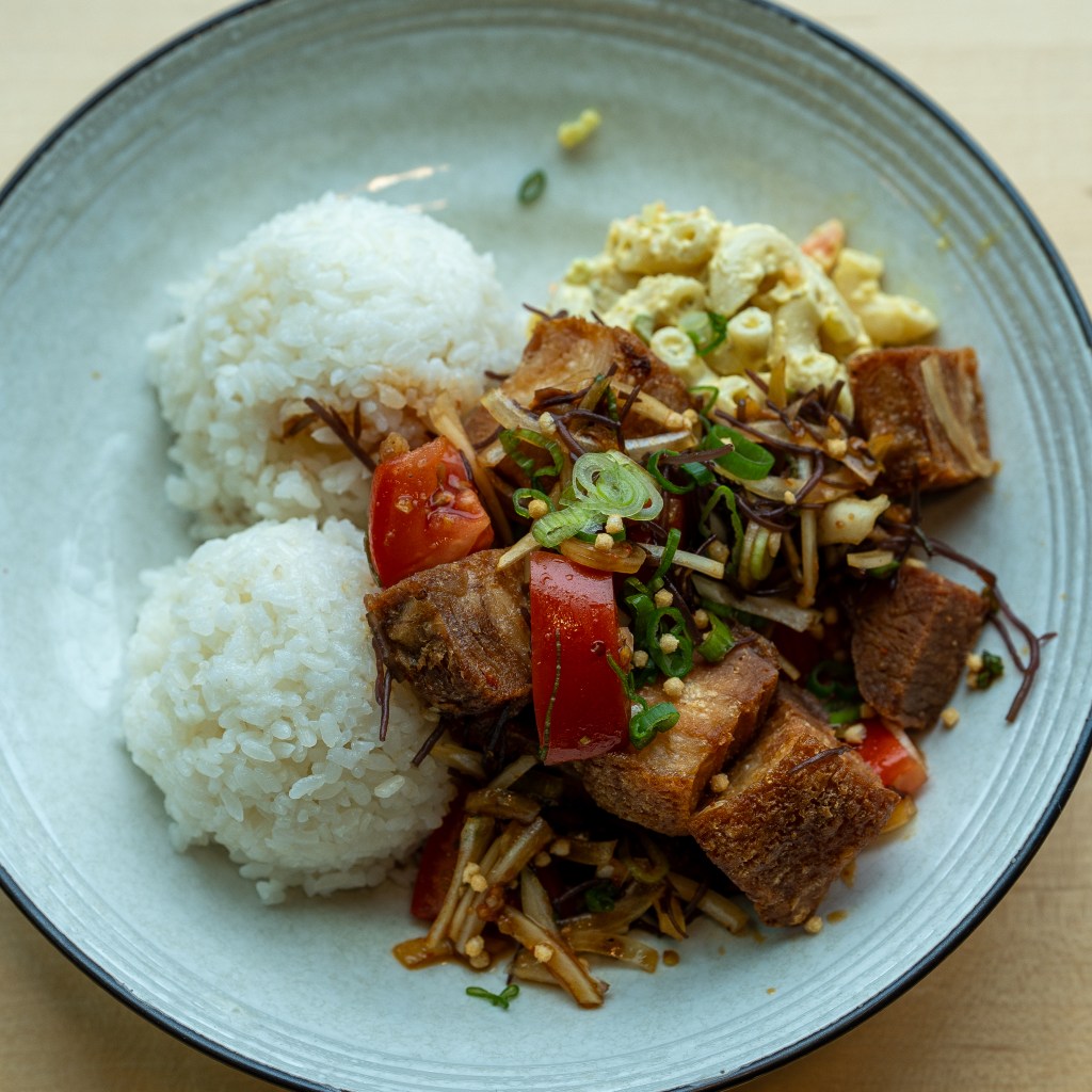 Kau Kau is a new Hawaiian restaurant that opened up two months ago on Alberta. Married chefs Tracee and Brandon are bringing their own twist and flair to Hawaiian food and the plate lunch. Meticulous care is being brought not only to each dish but also to the sides, condiments and even the rice! I hesitate to use the word “elevated” in this context, but they are definitely bringing a level of quality and care not normally seen in PNW Hawaiian food.