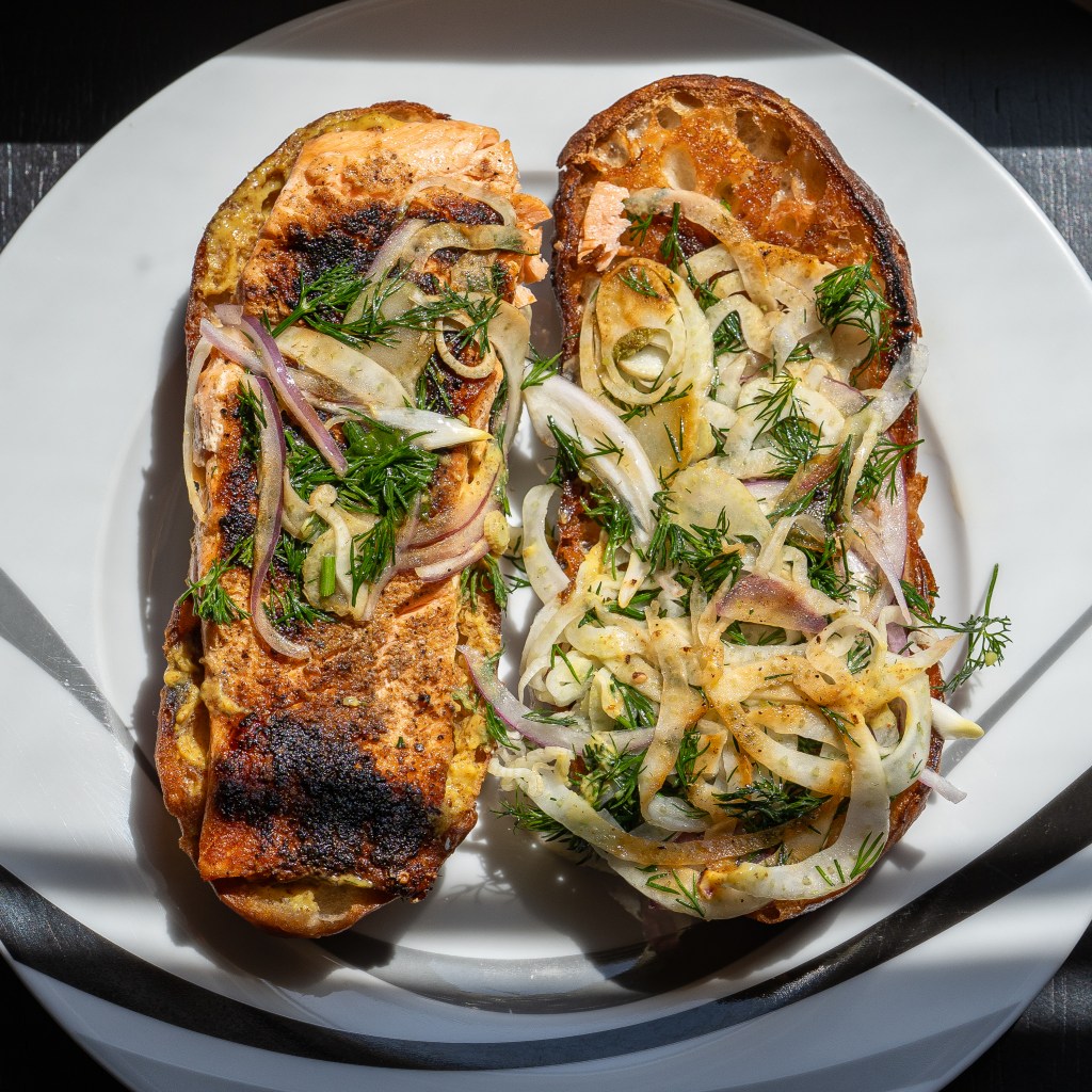 Last but not least is this beautiful salmon sandwich from May of this year. I made it open face so you can see how gorgeous the fish and veggies are. Coho salmon dusted with a roasted dandelion root rub, shaved fennel, copious amounts of dill and roasted parsnip spread. Sumptuous. Casually elegant. Elegantly rustic. Delicious. I love love love a well made salmon sandwich and this was perfect. Can you ask for better companions than fennel and dill? One of the best sandwiches of the year. One of the items not shown in the pics above is a side of pickled veggies which I always add to whatever order, and you should to. Happy eating, mangia!