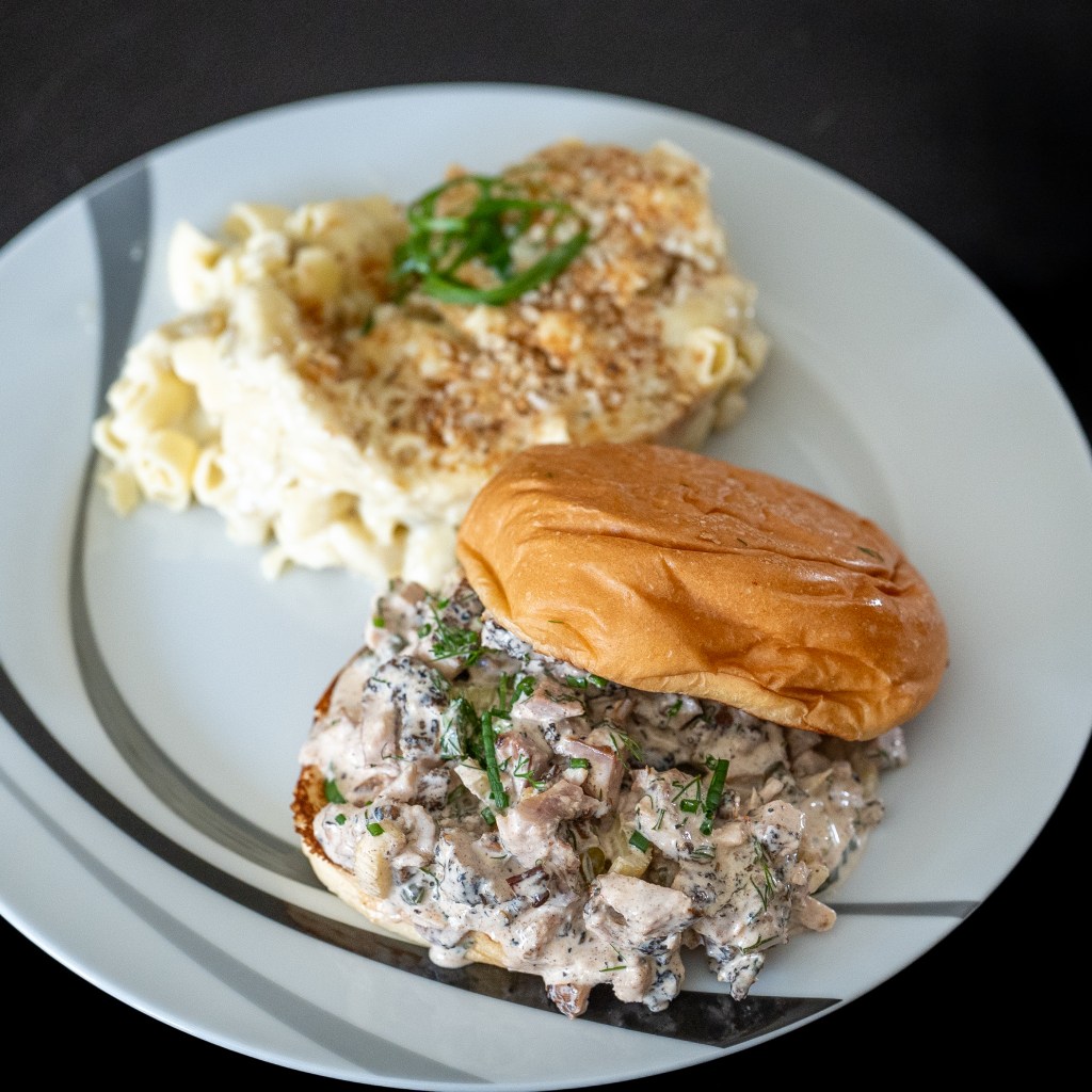 Chicken Salad Sandwich with queso mac from HarBQ. HarBQ is a BBQ truck that operates in the parking lot of Von Ebert Brewing in North Portland. Some of the best BBQ in town, they always run specials and new items. Their newest item is a smoked chicken thigh salad sandwich. It’s so good! I love a good chicken salad sandwich. Also their queso is on point. Mac dressed with Fontina and green chile queso. Nice little lunch to start Friday and the weekend off right.