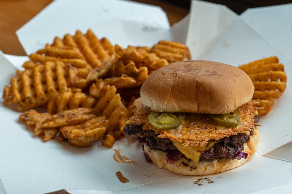 Burger & Waffle Fries from Burger Syndicate. On Saturday I was invited to get a sneak peek at a new burger joint that is opening up this week (April 8th). This is the new venture from Anthony of Nacheaux fame. He has had an event-based food cart for years which is one of my favorites. He also opened up in Moda Center this year as well. This will be his first brick-and-mortar in a while and I am stoked since he cooks some of my favorite food but I could rarely have it due the infrequent event schedule. Now I can grab a burger whenever I want! Located right behind Voodoo Doughnuts in Ankeny Alley, he is focusing on Smash Burgers and Waffle Fries, with a couple other items on the menu. I got the Afterburn Burger: 2 smash patties, American cheese, jalapeños, Frank’s hot aioli, cheese skirt bun. Super tasty, very on point burger. Perfect size. I got the waffle fries with lemon pepper seasoning which were delicious and were improved only by the syndicate dipping sauce.